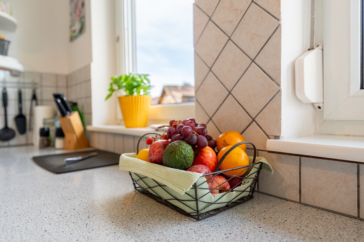 Im 1. Obergeschoss mit rund 75 m² befindet sich der zentrale Wohnbereich der Wohnung. Die separate Küche mit angrenzender Speis sorgt für praktischen Komfort im Alltag. Das großzügige Wohnzimmer überzeugt durch große Fensterflächen und den direkten Zugang zum Süd-West-Balkon, wodurch eine helle und angenehme Wohnatmosphäre entsteht.