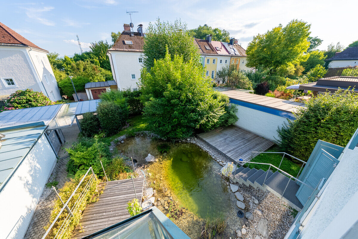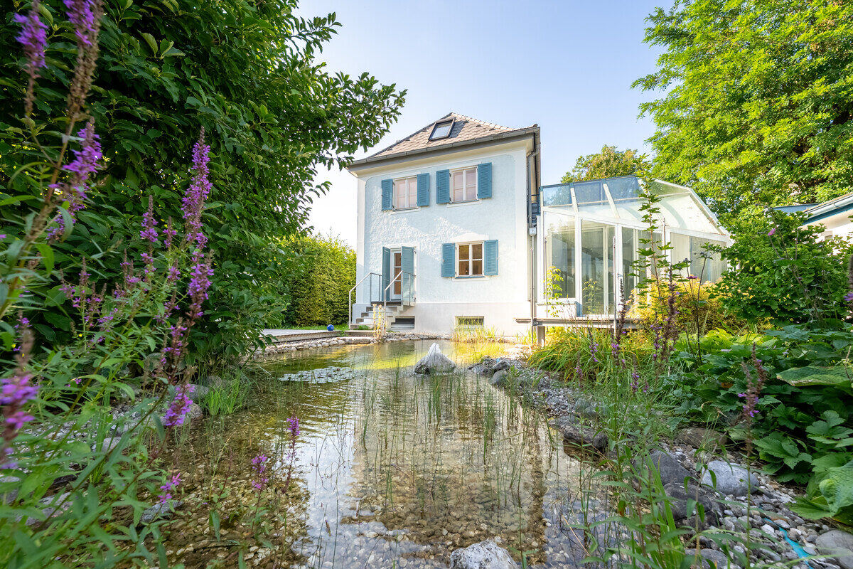 Das Einfamilienhaus „Eden“ verbindet zeitlose Architektur mit einem idyllischen Naturteich, üppigem Grün und einer großzügigen Terrasse – der perfekte Ort zum Entspannen und Genießen.