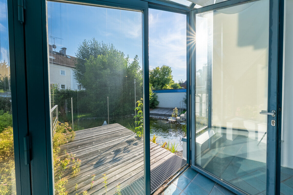 Der angrenzende Wintergarten öffnet den Blick auf Garten, Teich und Terrasse und erweitert den Wohnraum um eine helle, einladende Dimension in die Natur.