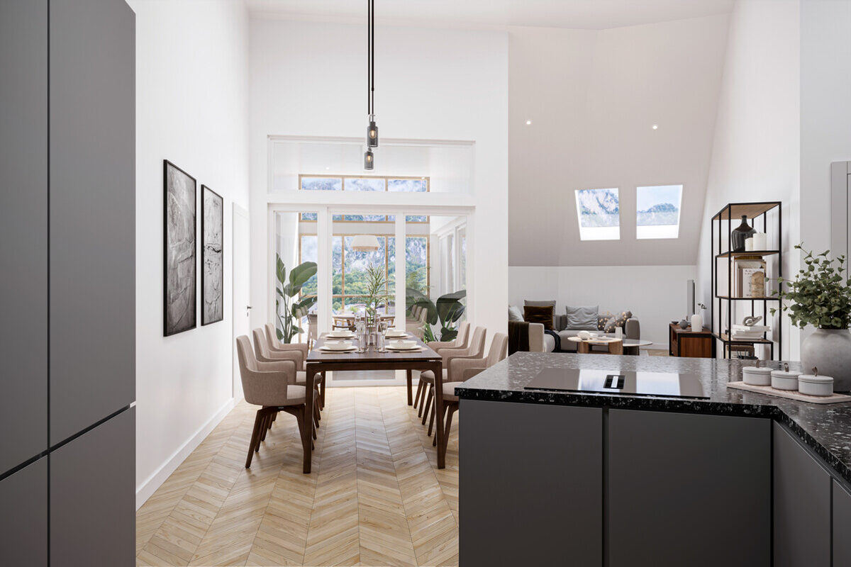 Qualität aus Leidenschaft: Im Inneren des Neubauprojekts steht hochwertiges Wohnen im Mittelpunkt: edle Materialien, zeitloses Design und eine durchdachte Ausstattung erzeugen ein behagliches Wohngefühl. Großformatige Glaselemente sorgen für viel Tageslicht und schaffen ein offenes Wohnambiente, während elegante Eichen-Massivholzböden für natürliche Wärme und Stil stehen. Die Nassbereiche sind mit exklusiven Marken-Armaturen von Hansgrohe sowie Villeroy & Boch sowie großflächigen Fliesen ausgestattet – ein klares Statement für moderne Architektur.