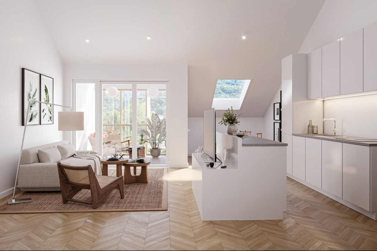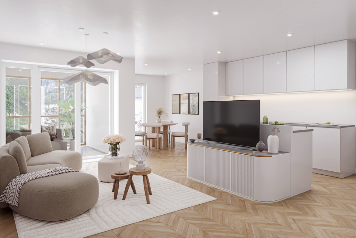 Im Inneren des Neubauprojekts steht hochwertiges Wohnen im Mittelpunkt: edle Materialien, zeitloses Design und eine durchdachte Ausstattung erzeugen ein behagliches Wohngefühl. Großformatige Glaselemente sorgen für viel Tageslicht und schaffen ein offenes Wohnambiente, während elegante Eichen-Massivholzböden für natürliche Wärme und Stil stehen. Die Nassbereiche sind mit exklusiven Marken-Armaturen von Hansgrohe sowie Villeroy & Boch und großflächigen Fliesen ausgestattet – ein klares Statement für moderne Architektur.