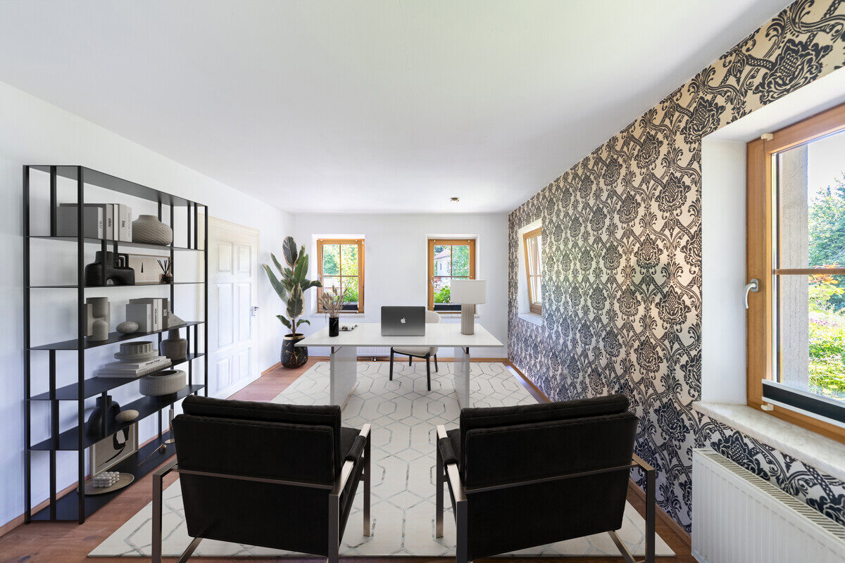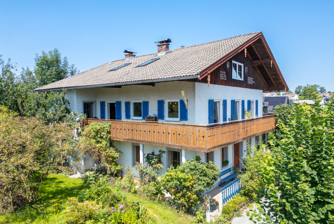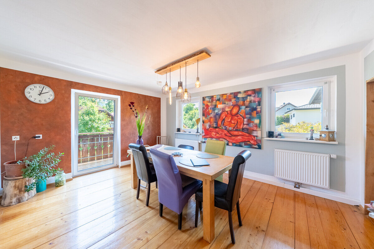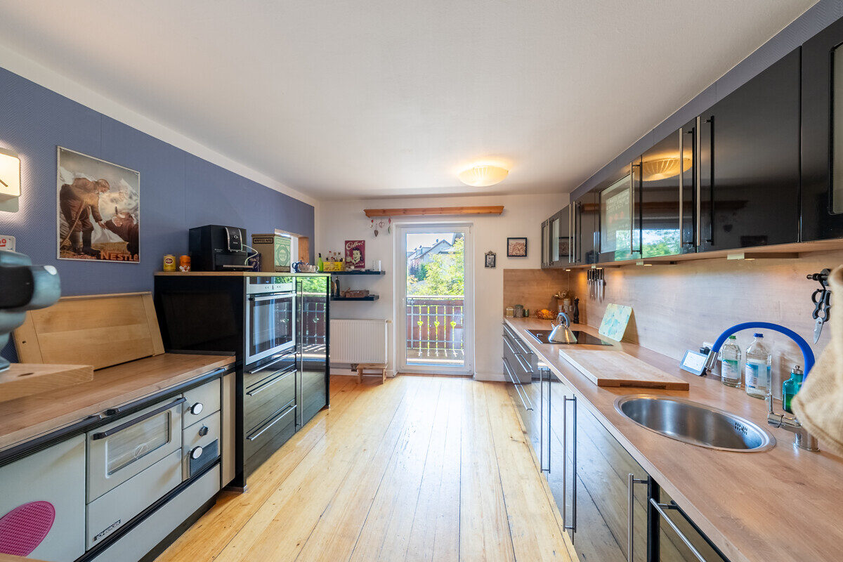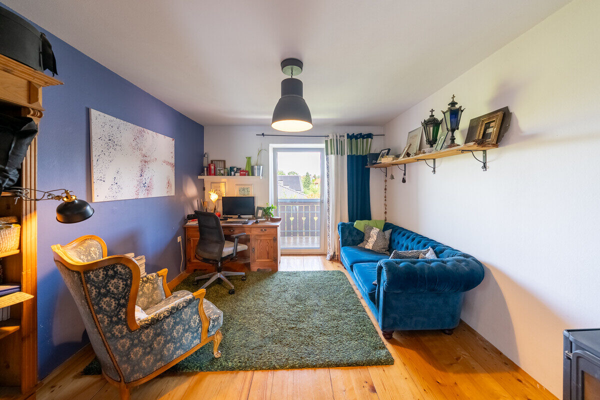 Im Obergeschoss sind 5 separat begehbare Räume als Schlafzimmer oder Homeoffice nutzbar. Die moderne Küche ist mit hochwertigen Geräten ausgestattet, der gemütliche Holzofen knistert im Wohnzimmer nebenan. Fast alle Räume verfügen über einen direkten Zugang zum umlaufenden Balkon – hier sitzend entspannt man – unterstützt durch das Plätschern des Bächleins gegenüber der Straße. Ein elegantes Badezimmer mit Badewanne sowie ein separates WC sorgen für zusätzlichen Komfort.