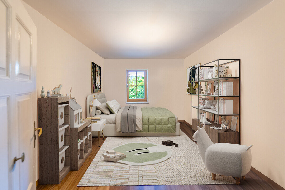 Das Erdgeschoss verfügt über ca. 110 m² Nutzfläche und einen eigenen Eingang. Hier befinden sich vier Zimmer, in einem davon sind Anschlüsse für eine Küche bereits vorhanden.