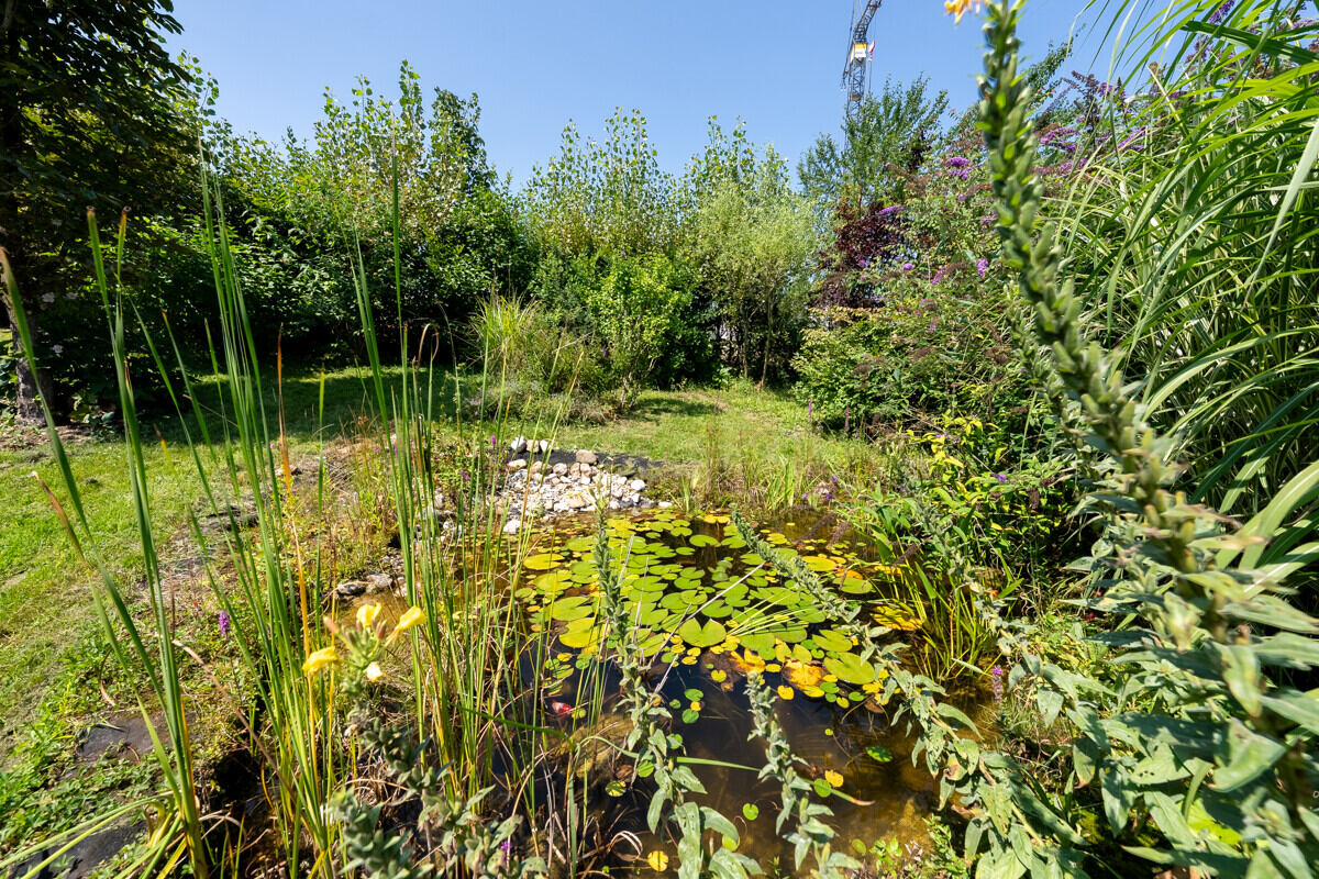Ein idyllisches Biotop, eine gemütliche Gartenhütte, ein buntes Gemüsebeet und alte Obstbäume schaffen eine Oase zum Gärtnern, Entspannen und Genießen – ideal für gemeinsame Stunden mit Familie, Freunden und Haustieren.