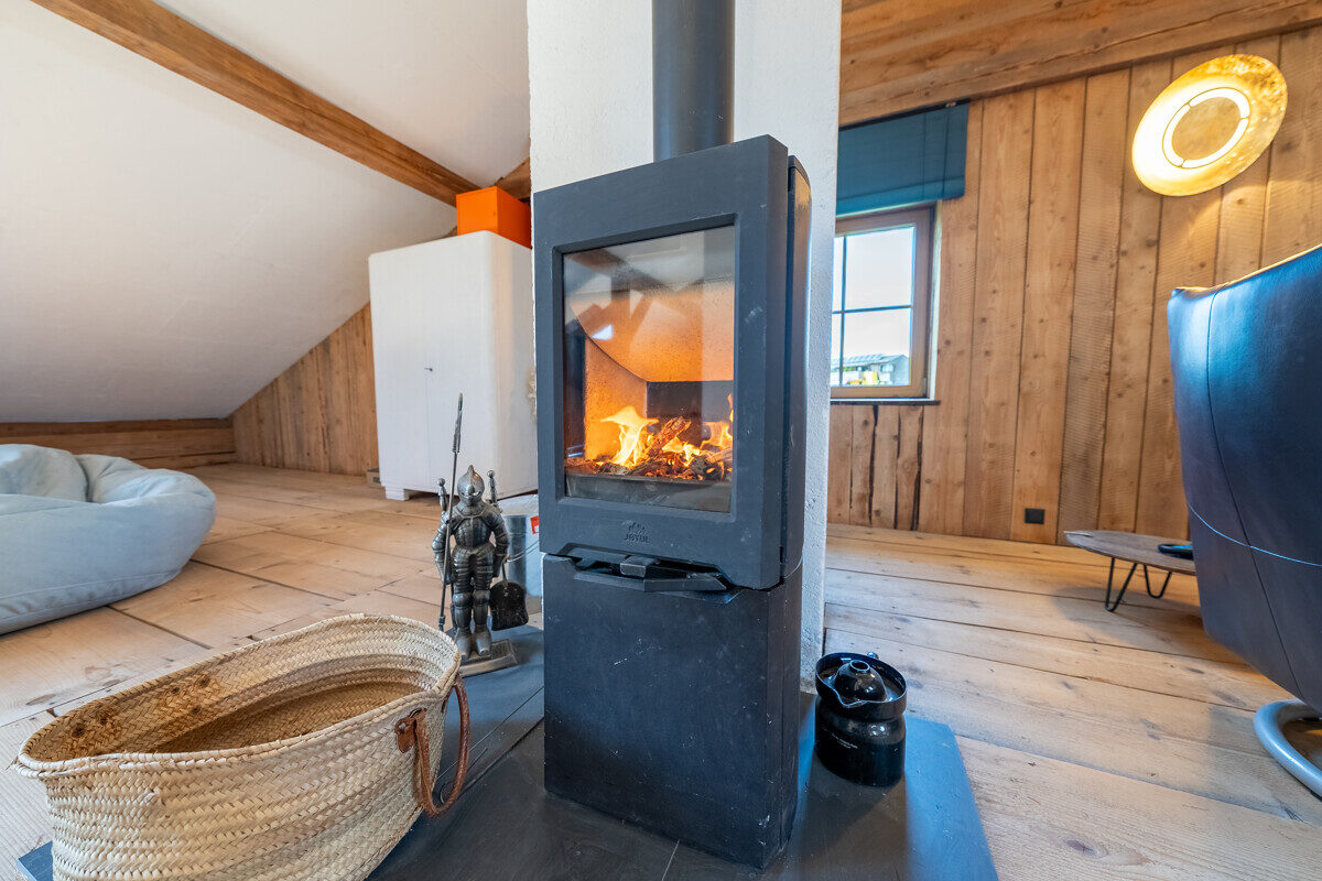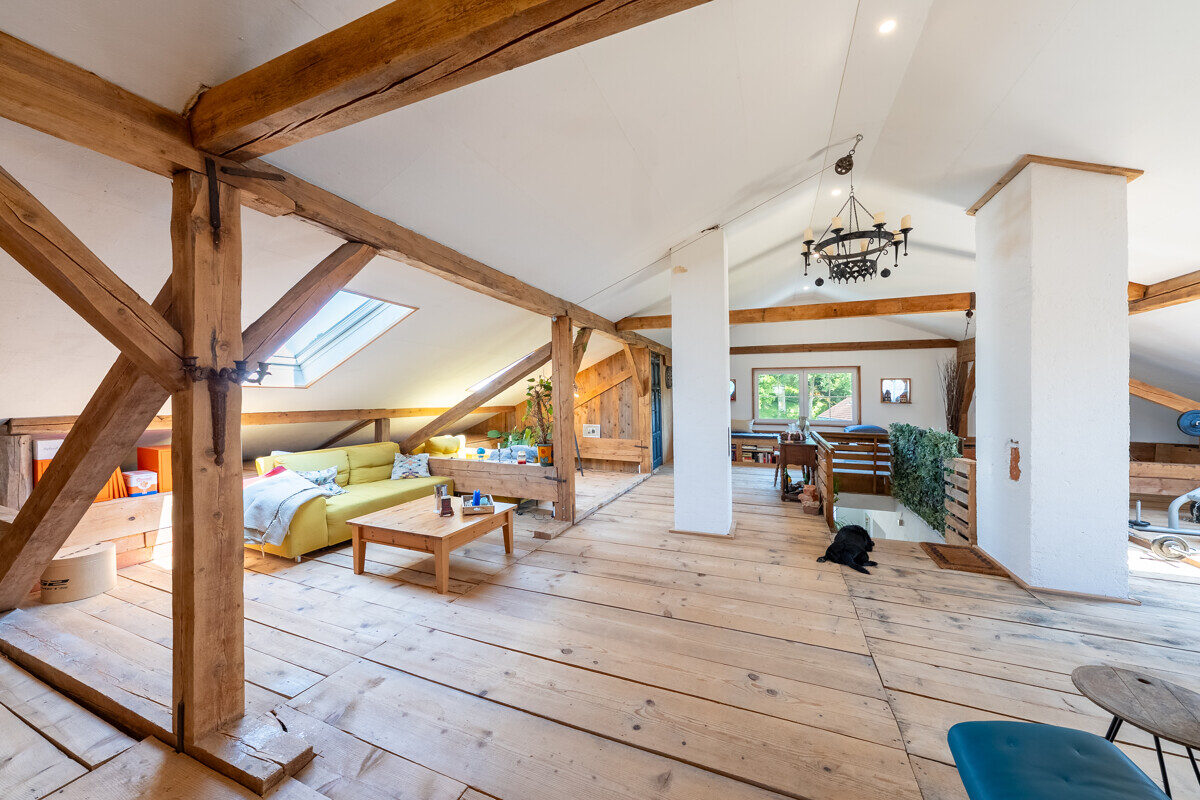 Das offene Dachgeschoss verleiht dem Haus seinen besonderen Charme. Ein dänischer Ofen sorgt hier für wohlige Wärme, während das großzügige Raumgefühl und die liebevollen Details begeistern. Diese Nutzfläche bietet Platz für Hobbies, Sport oder eine gemütliche Leseecke.