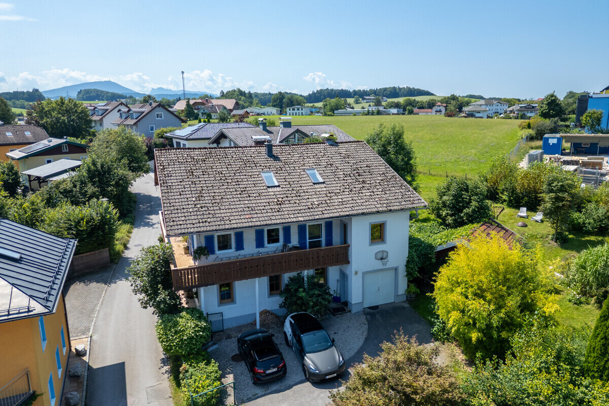 Das Haus liegt in einer ruhigen Wohngegend, Familien fühlen sich hier wohl, denn ein Park mit Spielplatz, der Kindergarten, eine Schule und Sportmöglichkeiten befinden sich in fußläufiger Erreichbarkeit, ebenso wie öffentliche Verkehrsmittel. Ein gegenüber der Straße verlaufender Bach plätschert fröhlich Richtung Wallersee.