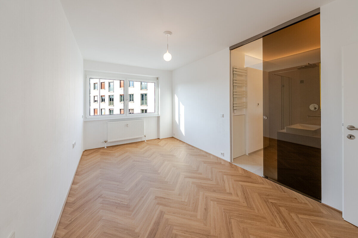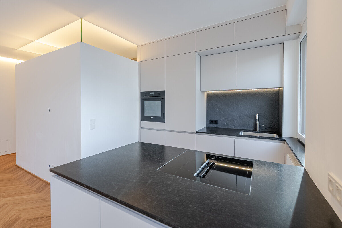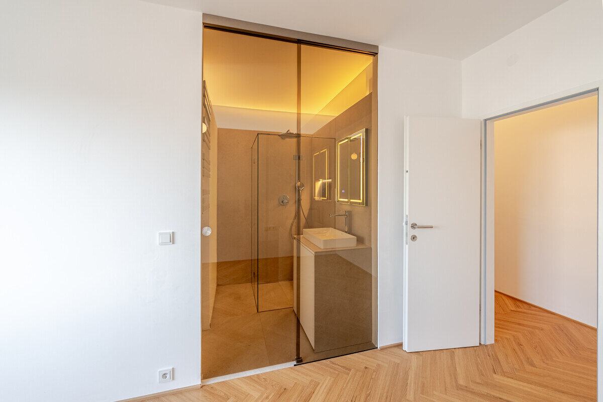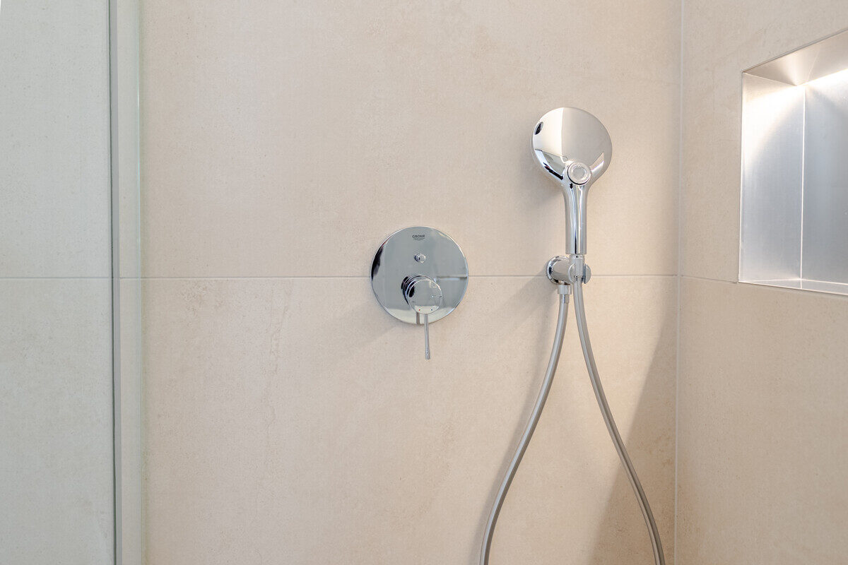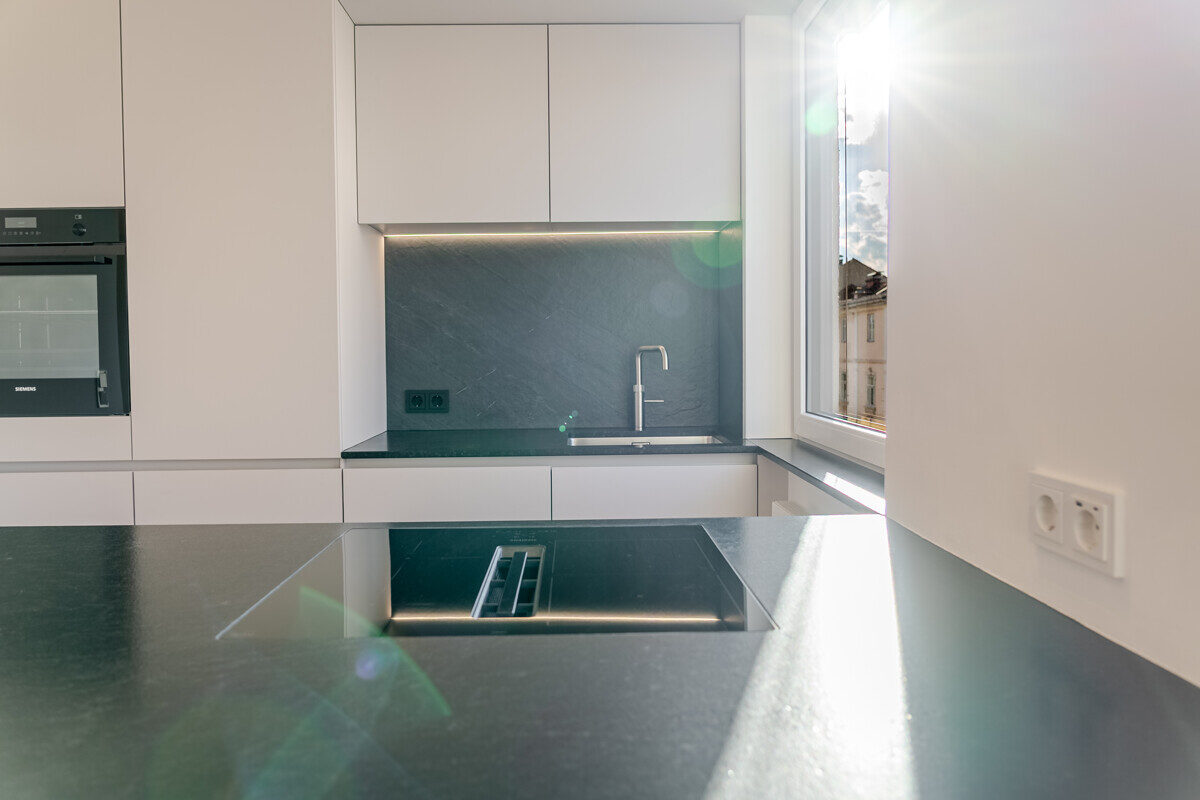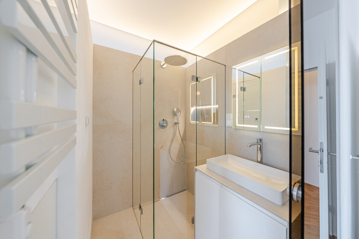 Die maßgefertigte Tischlerküche ist das beste Beispiel einer Ausstattung, die praktisch nie in Mietwohnungen umgesetzt wird – Natursteinarbeitsplatte, Siemens Markengeräte und Quooker-System für gekühltes, kochendes und sprudelndes Wasser direkt aus dem Hahn. Im en-suite-Badezimmer setzt sich dieser Qualitätsanspruch weiter fort: Großformatige italienische Fliesen in Sandsteinoptik, Fußbodenheizung, Oberlichtverglasung, Rauchglas-Schiebetür mit Soft-Close, bodenebene Dusche mit Verglasung nach Maß, ergänzt durch praktische Techniklösungen.