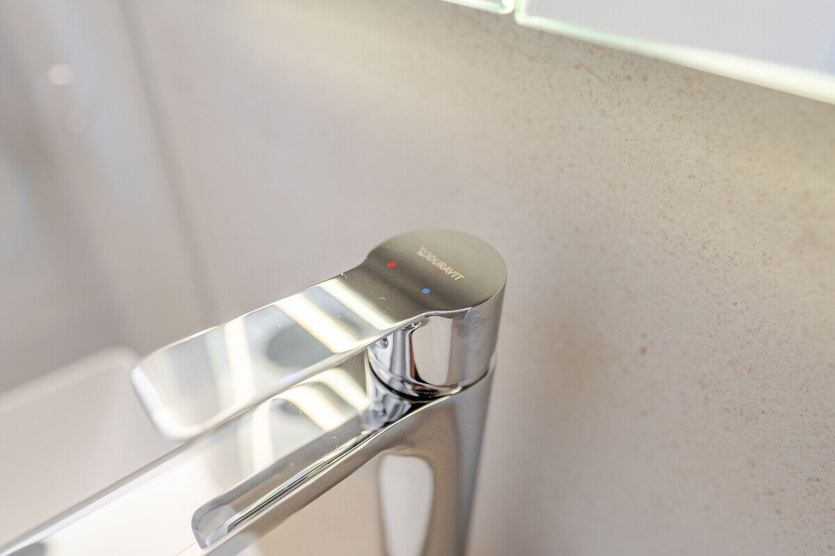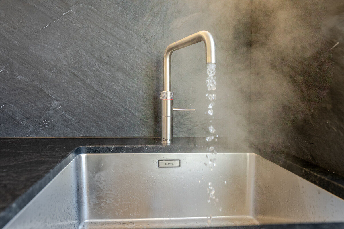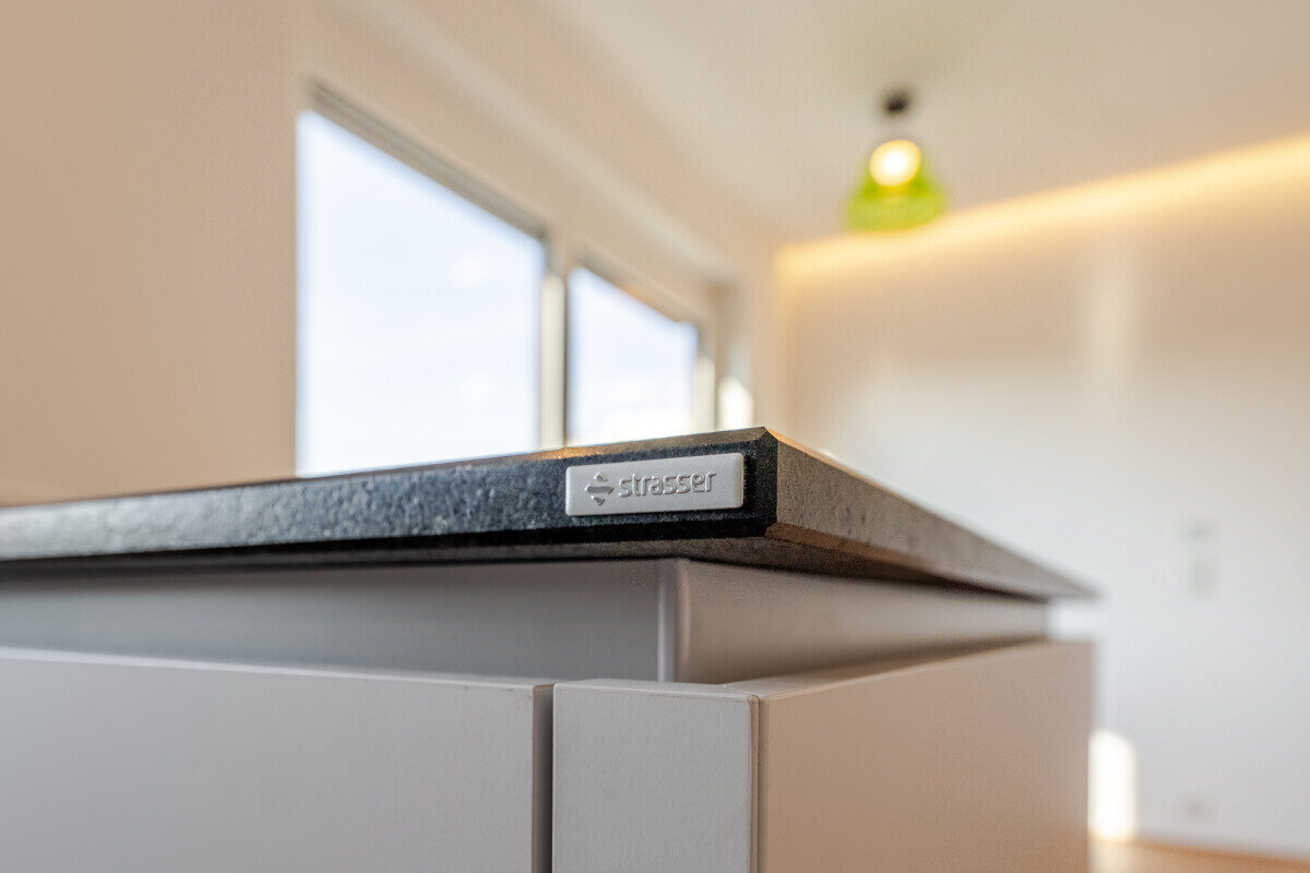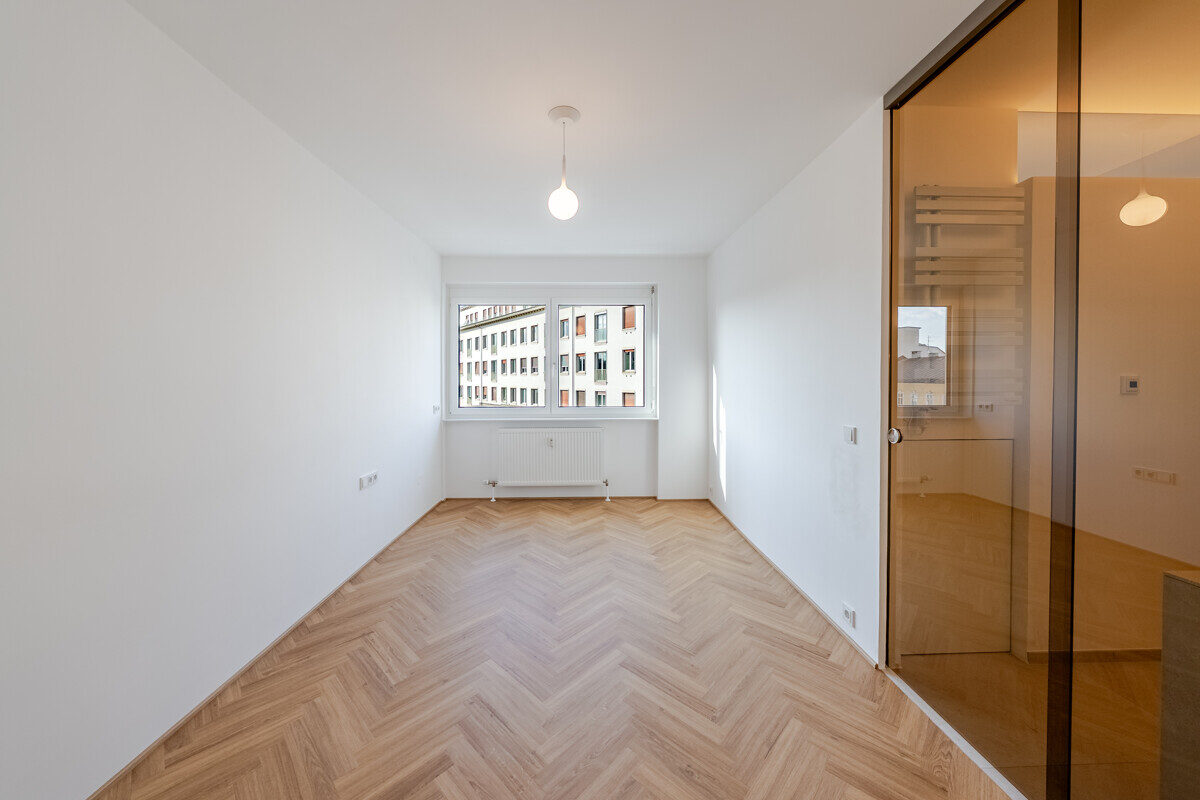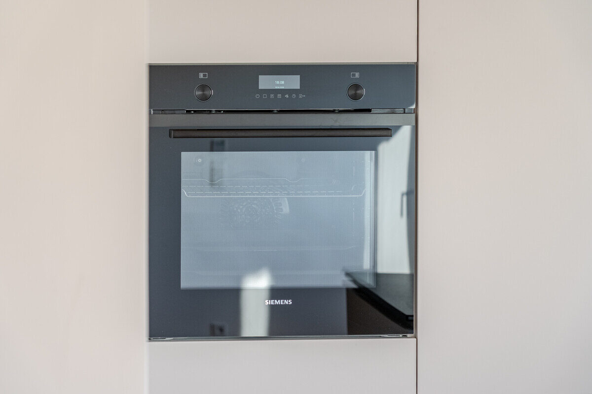 Die maßgefertigte Tischlerküche ist das beste Beispiel einer Ausstattung, die praktisch nie in Mietwohnungen umgesetzt wird – Natursteinarbeitsplatte, Siemens Markengeräte und Quooker-System für gekühltes, kochendes und sprudelndes Wasser direkt aus dem Hahn. Im en-suite-Badezimmer setzt sich dieser Qualitätsanspruch weiter fort: Großformatige italienische Fliesen in Sandsteinoptik, Fußbodenheizung, Oberlichtverglasung, Rauchglas-Schiebetür mit Soft-Close, bodenebene Dusche mit Verglasung nach Maß, ergänzt durch praktische Techniklösungen.