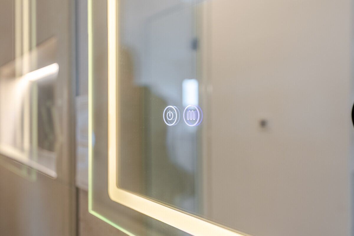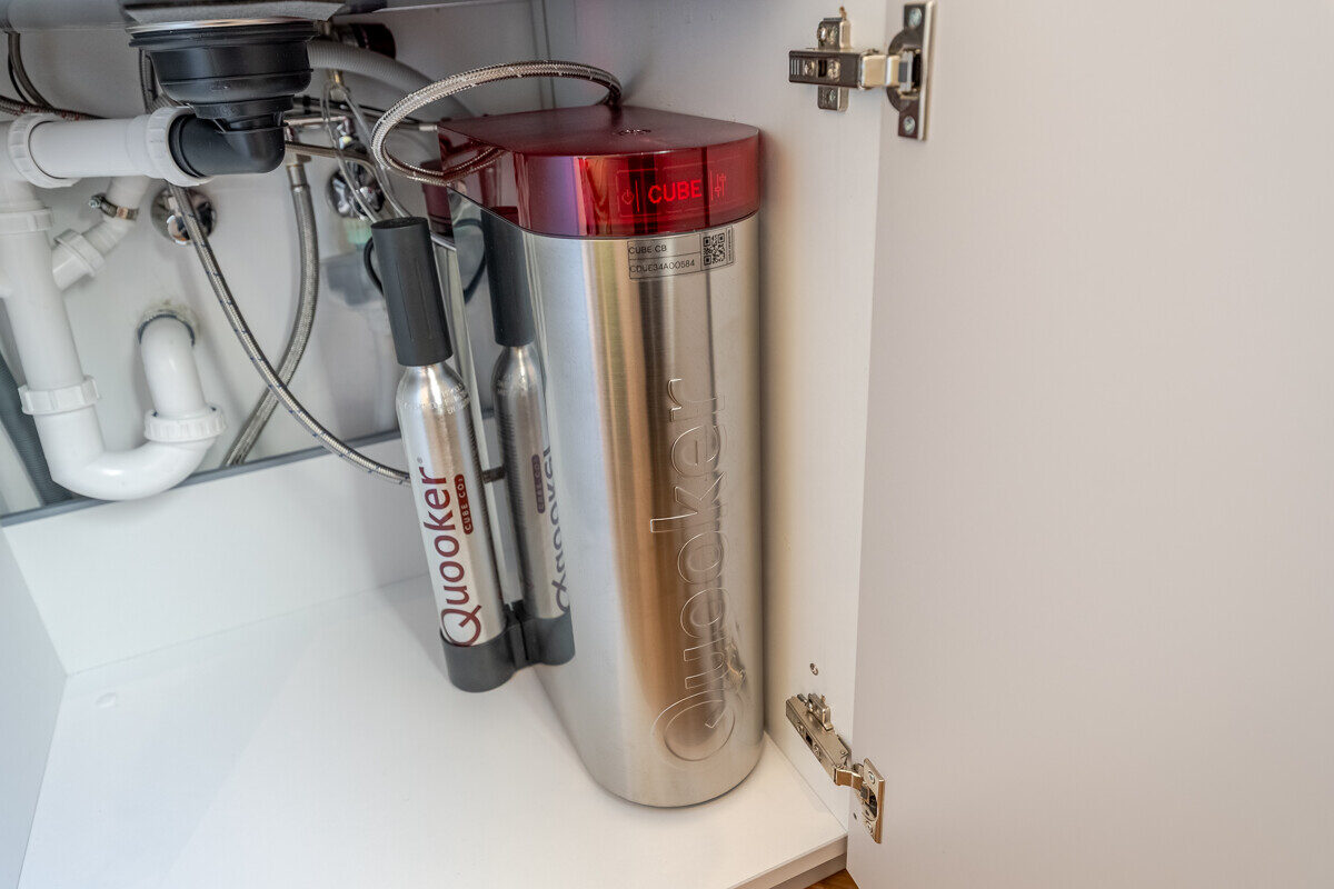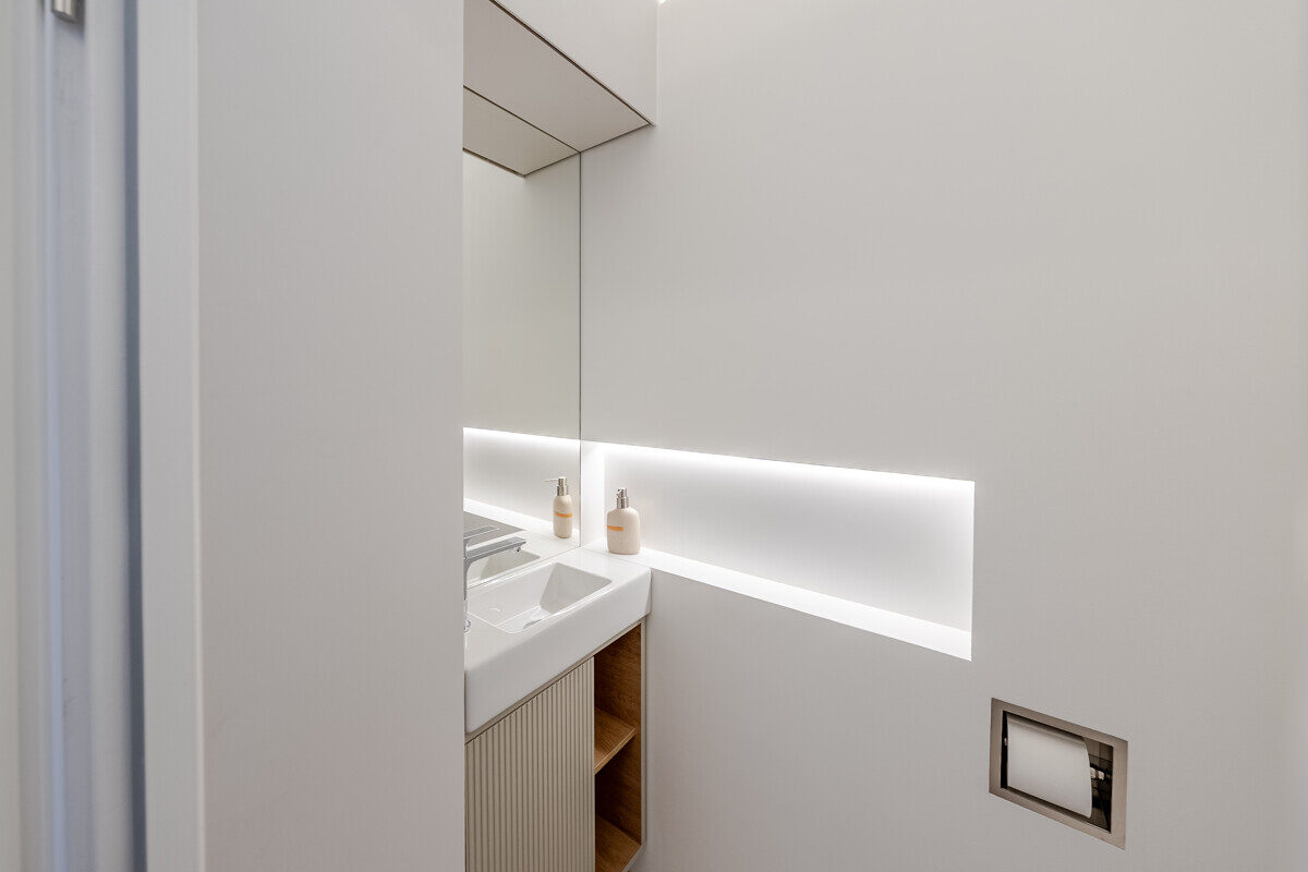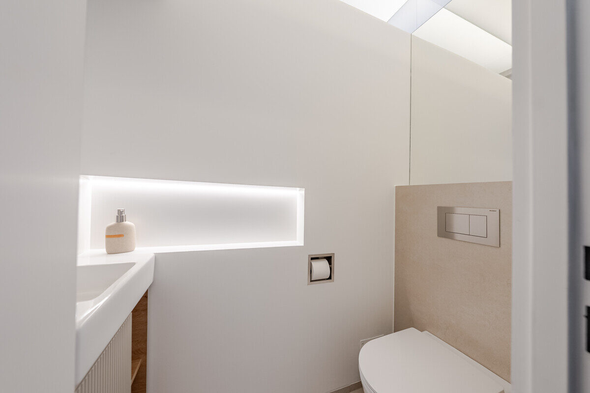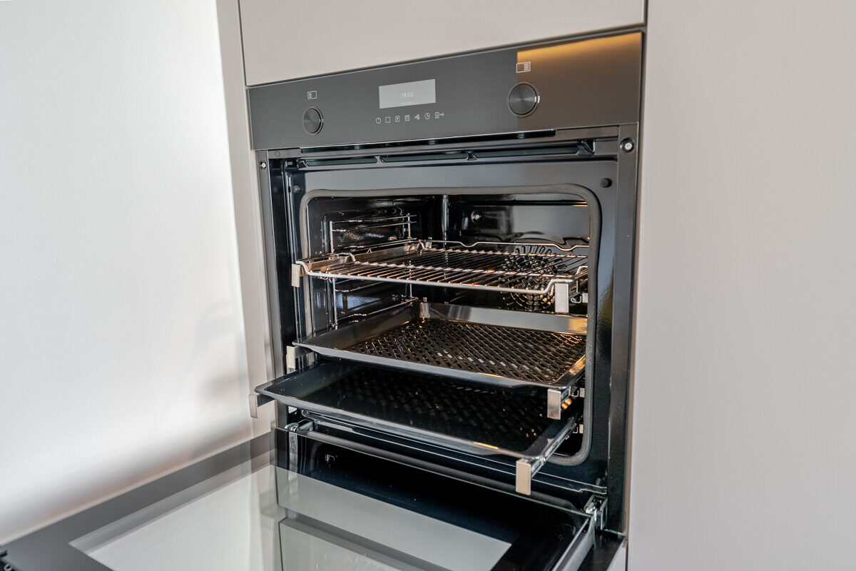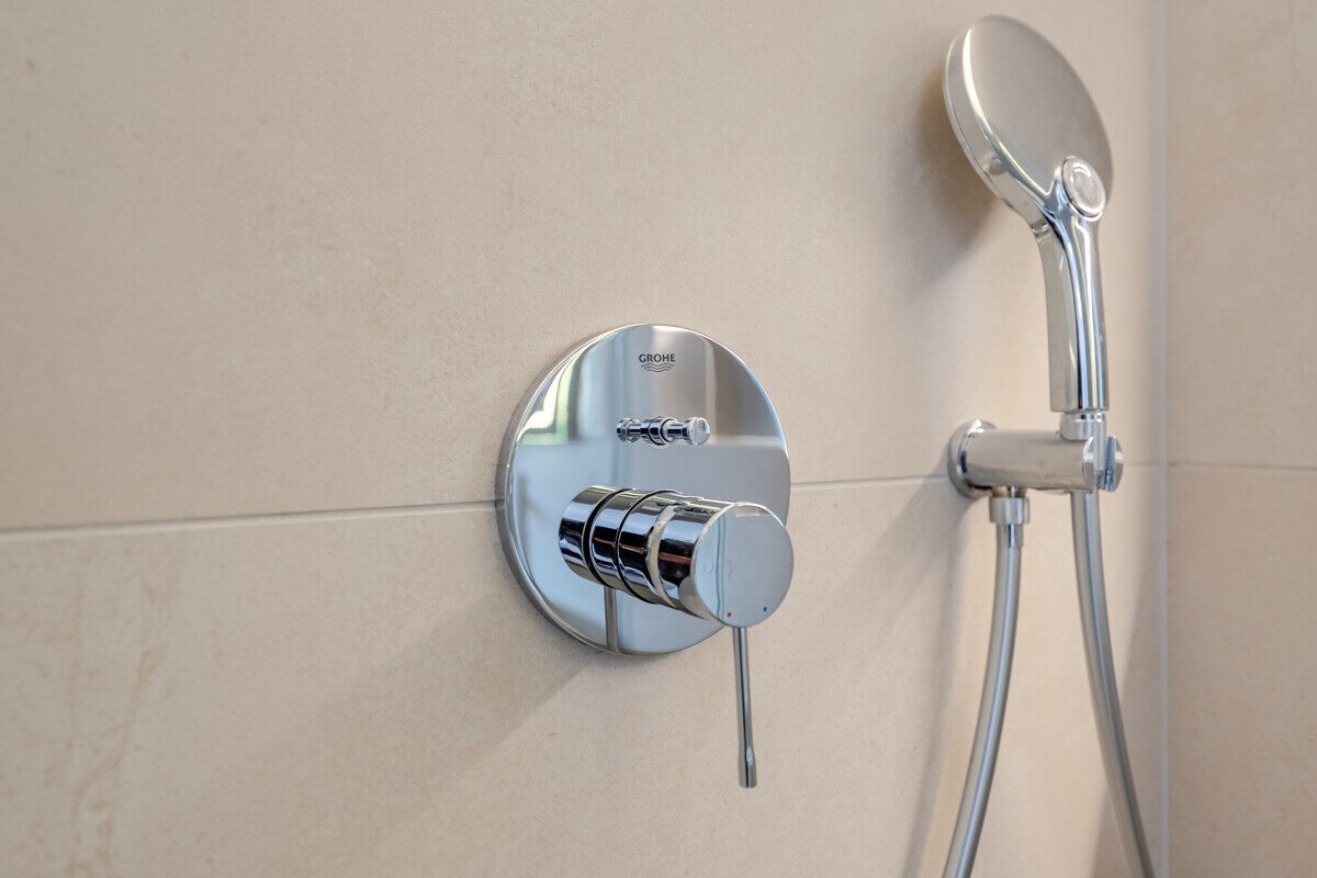 Die maßgefertigte Tischlerküche ist das beste Beispiel einer Ausstattung, die praktisch nie in Mietwohnungen umgesetzt wird – Natursteinarbeitsplatte, Siemens Markengeräte und Quooker-System für gekühltes, kochendes und sprudelndes Wasser direkt aus dem Hahn. Im en-suite-Badezimmer setzt sich dieser Qualitätsanspruch weiter fort: Großformatige italienische Fliesen in Sandsteinoptik, Fußbodenheizung, Oberlichtverglasung, Rauchglas-Schiebetür mit Soft-Close, bodenebene Dusche mit Verglasung nach Maß, ergänzt durch praktische Techniklösungen.