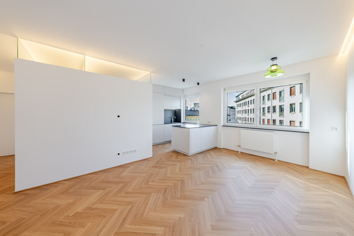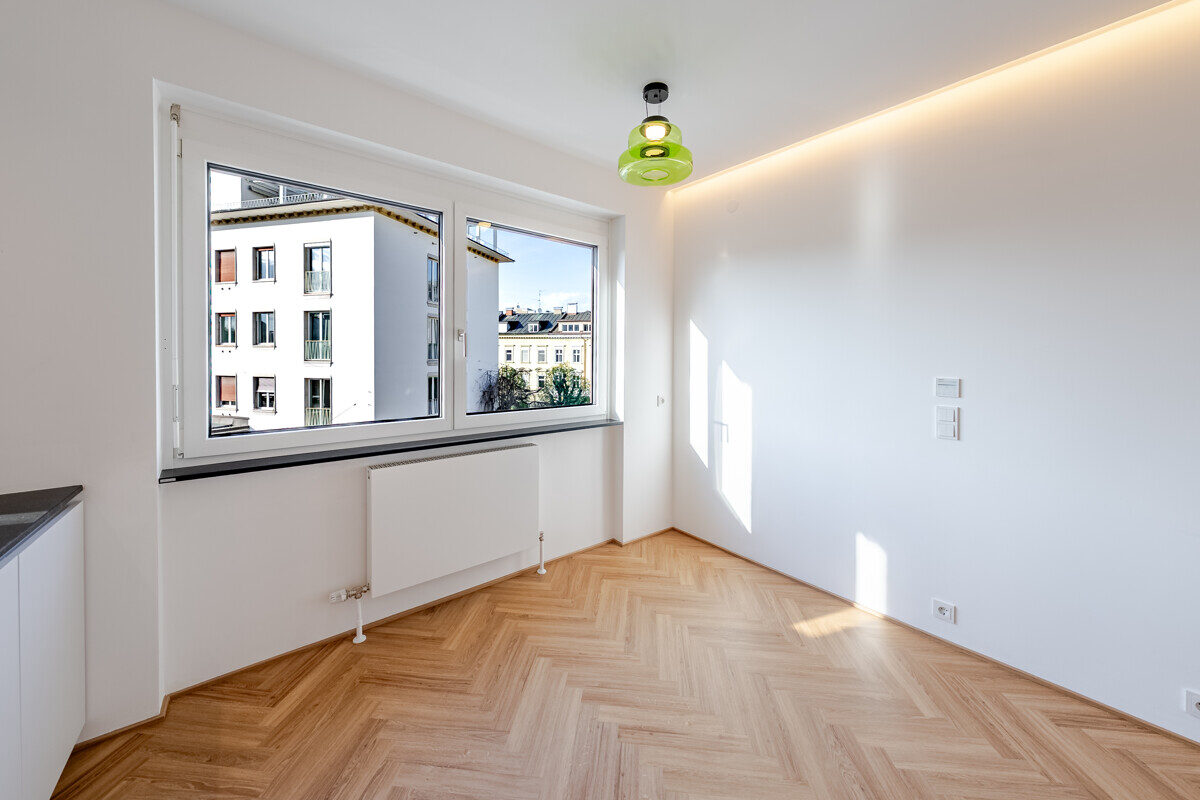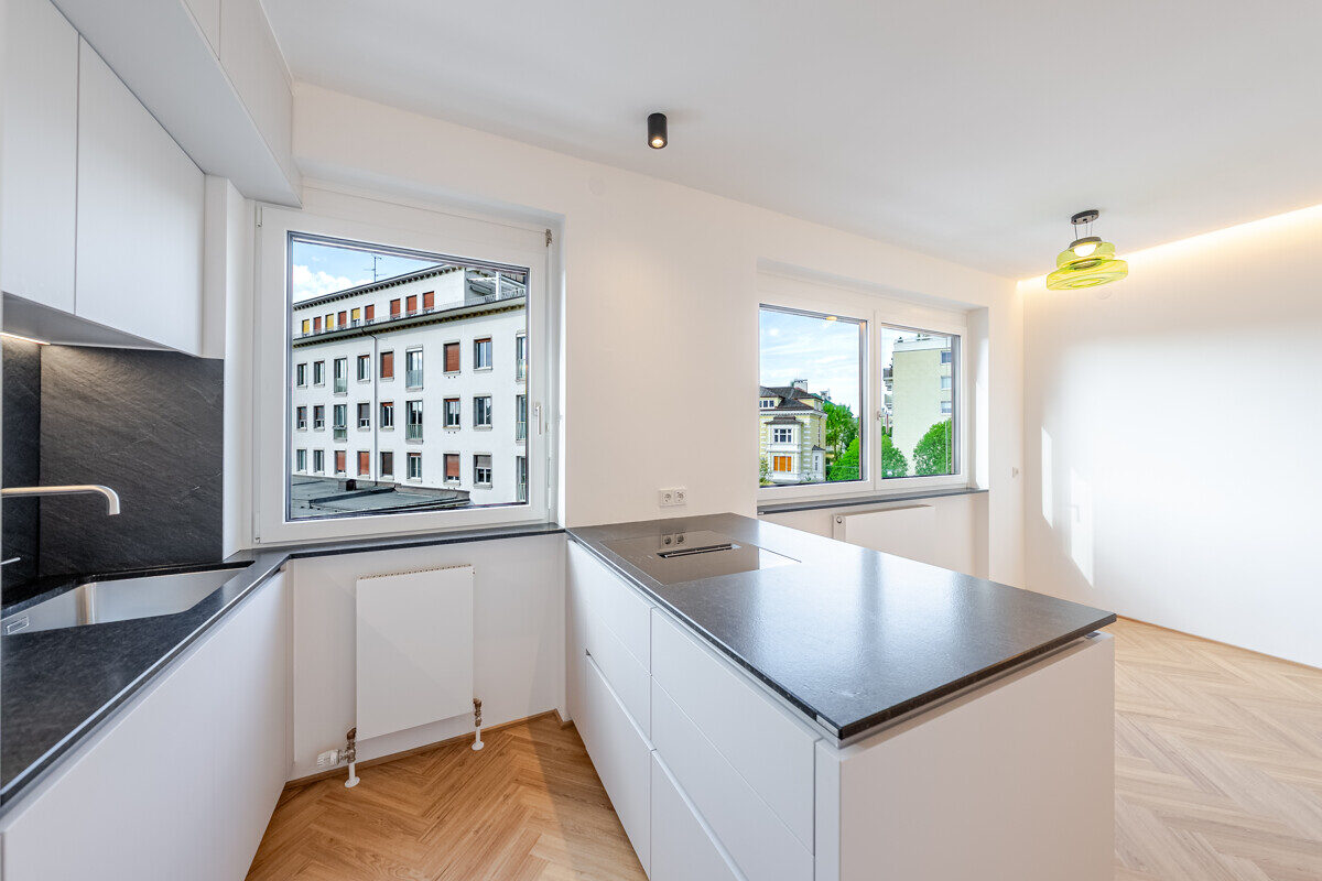 Alle Ebenen der Wohnung folgen diesem Qualitätsanspruch einer maßgeplanten Eigentumswohnung: Fischgrätboden, stilvolle Designbeleuchtung, Steckdosen mit USB/USBC-Direktlademöglichkeit und großformatige, vollständig öffenbare neue Fenster mit Aussicht, Außenbeschattung und transluzenten Innenplissees.