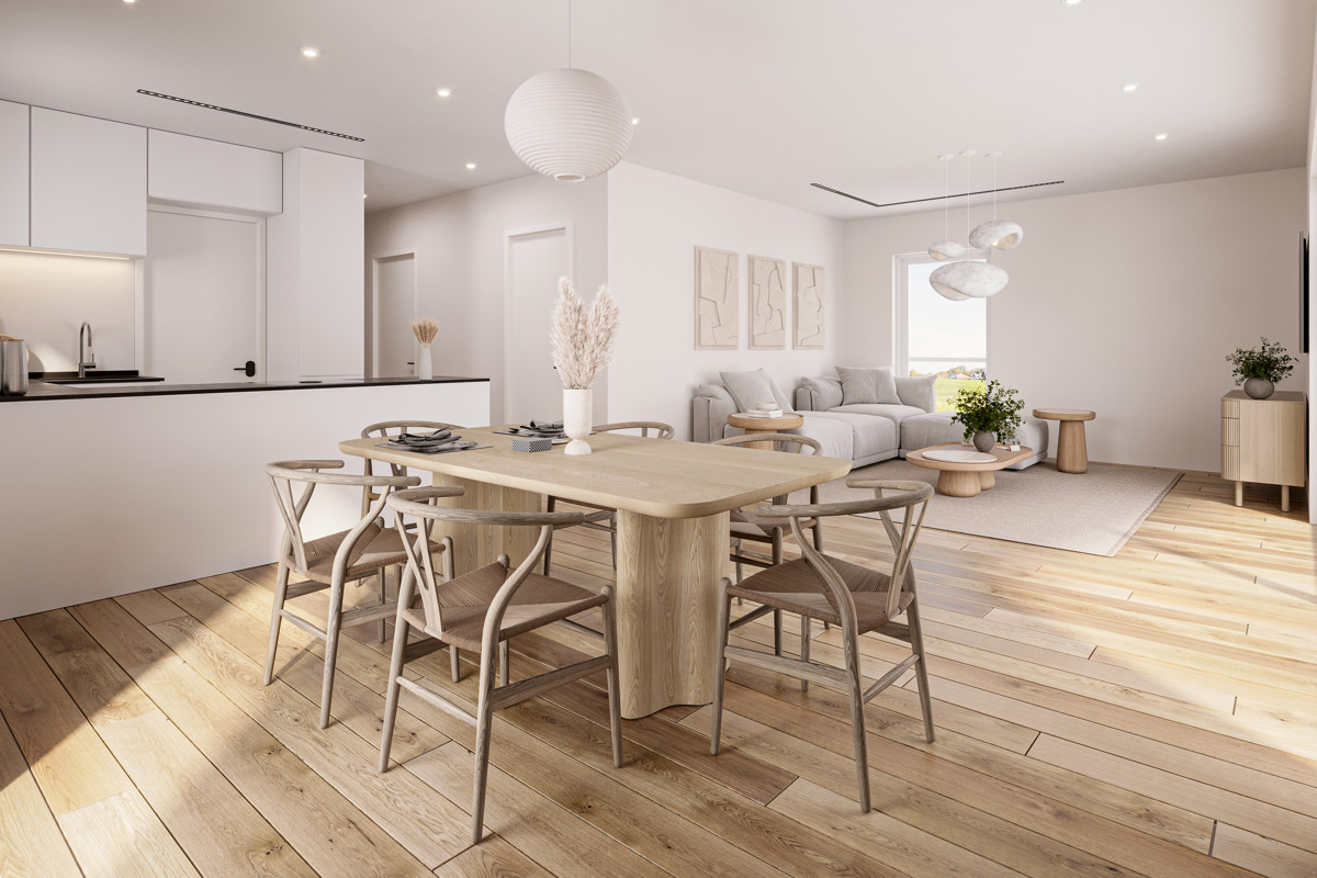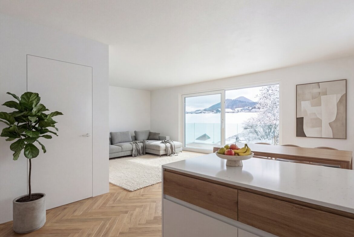 Die markante Außenfassade setzt mit edlen Details, wie Glasbalkonen und Aluminiumdetails einen starken visuellen Akzent und verleiht dem Projekt einen unverwechselbaren Charakter. Im Inneren offenbart sich ein harmonisches Konzept, das Raum für Individualität lässt. Hochwertige Materialien wie rustikale Eichenlandhausdielen, schaffen ein Flair aus Wärme und Eleganz.