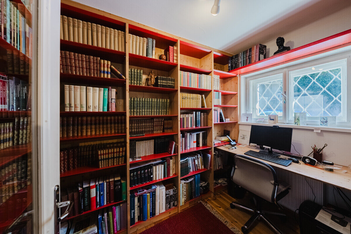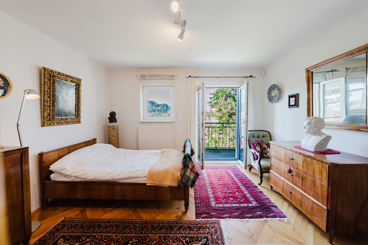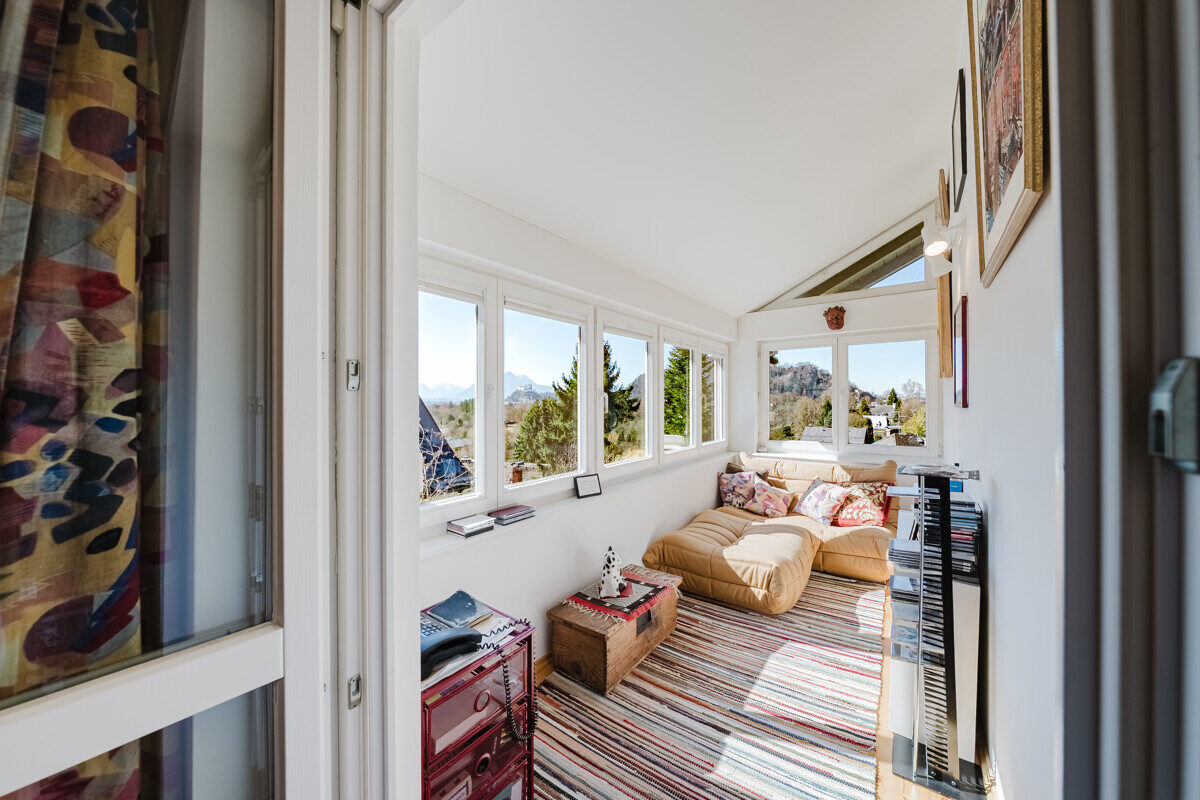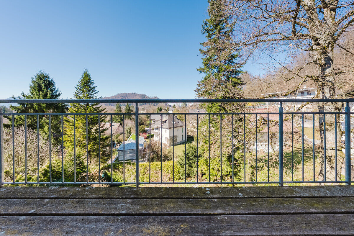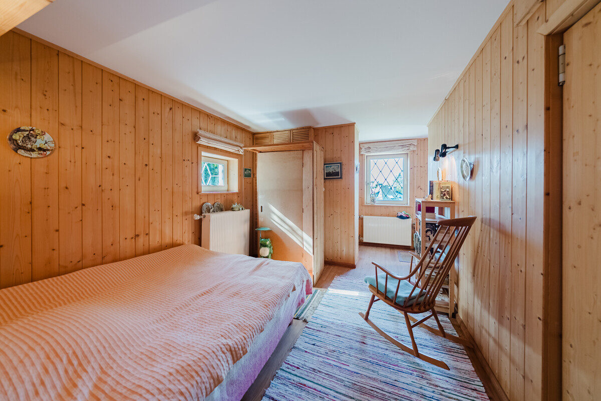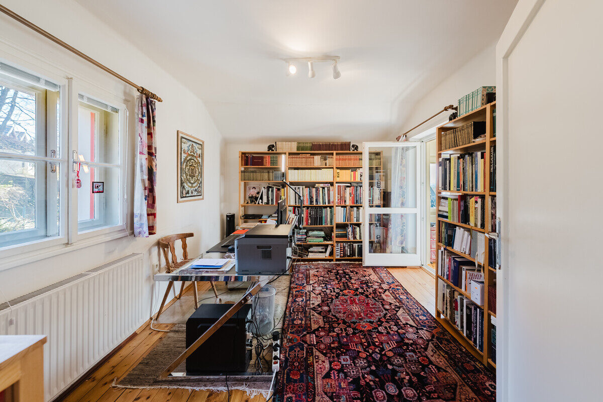 Das Obergeschoss bietet drei Schlafzimmer, ein zusätzliches Arbeitszimmer, ein Badezimmer, ein separates WC sowie einen Balkon für freies Durchatmen und Frischluft-Genießen.
